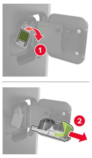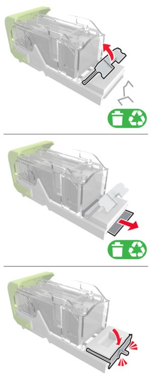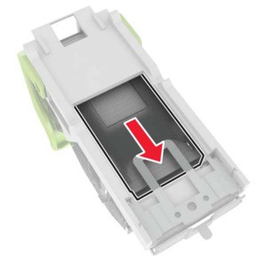 If the staples are at the rear of the cartridge, then shake the cartridge downward to bring the staples near the metal bracket.