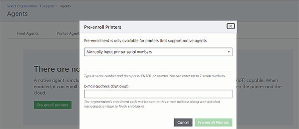 From the Pre‑enroll Printers dialog, do one of the following:- SelectManually input serial number, type the printer serial number, and then pressEnter.