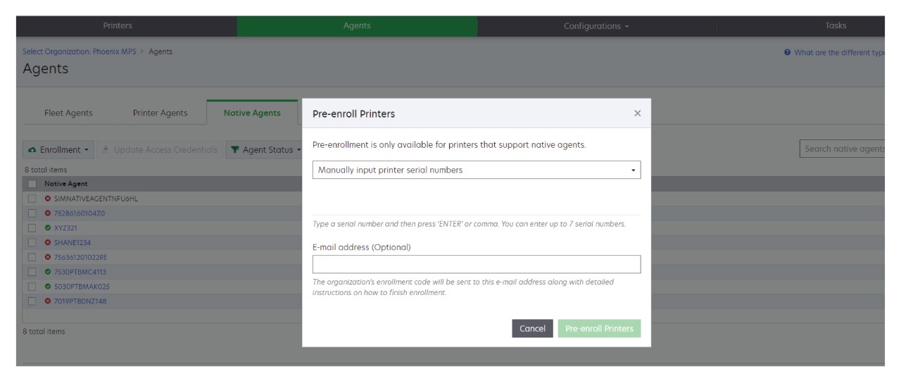 If devices are already enrolled:- ClickAgents>Native Agents>Enrollment>Pre‑enroll>Pre‑enroll printers.