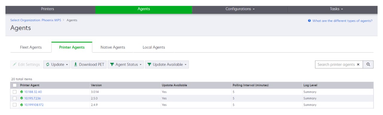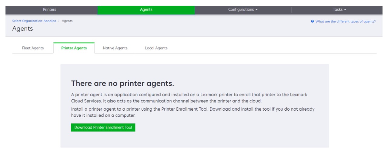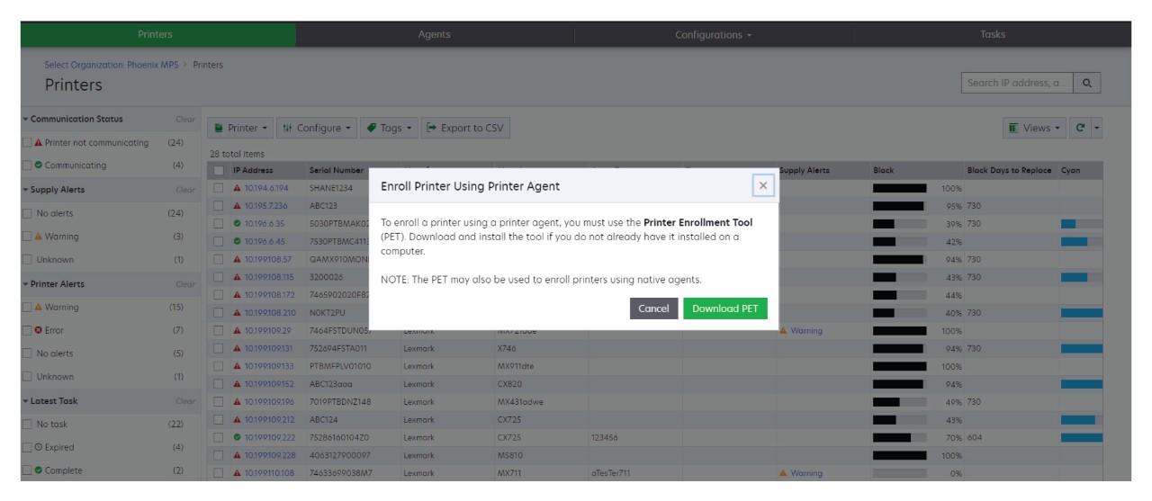 Use the Printer Enrollment Tool (PET) to discover and enroll printers in the Lexmark Cloud Services website. Depending on the printer firmware version, the PET installs the Printer Agent application in the printer or uses the Native Agent.