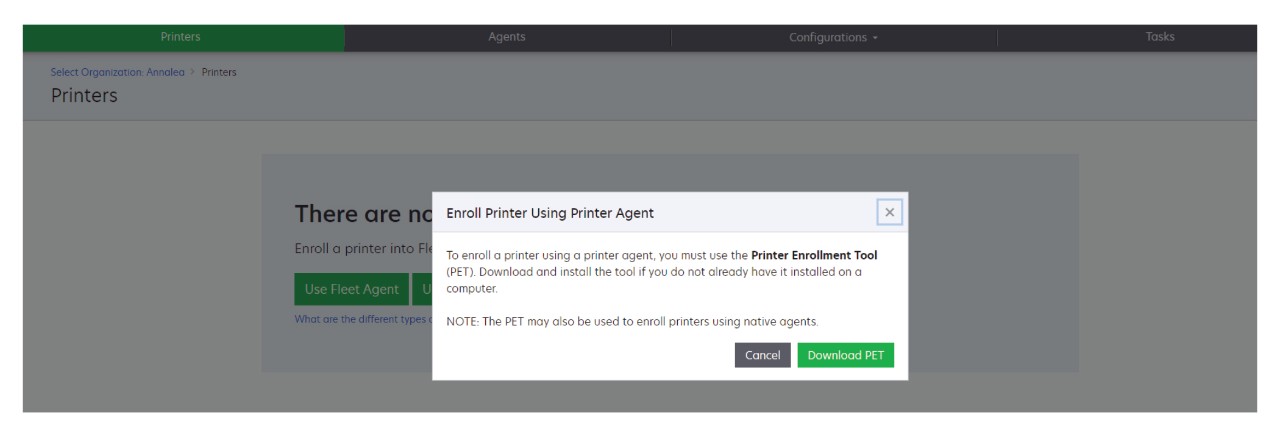 If you already have some devices enrolled, then you can download the PET by following the steps:- ClickPrinter>Enroll printer using>Printer agent>Download PET.