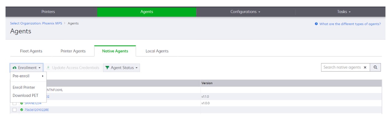- ClickPrinter>Enroll printer using>Native agent>Enrollment>Download PET.