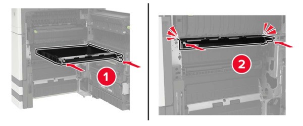 Insert the paper guide.Secure the transfer belt.Reattach the door stopper.Close the door, and then turn on the printer.