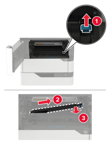Remove the used transfer roller.The inside of the printer might be hot. To reduce the risk of injury from a hot component, allow the surface to cool before touching it.