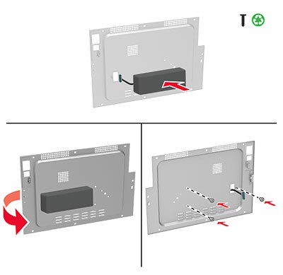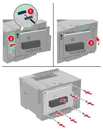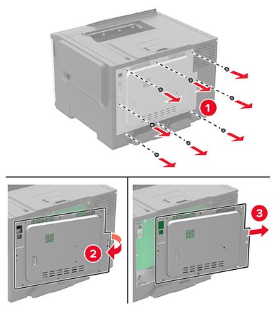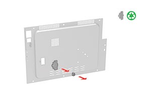 - Turn off the printer.Unplug the power cord from the electrical outlet, and then from the printer.Using a flat‑head screwdriver, remove the controller board access cover.Controller board electronic components are easily damaged by static electricity. Touch a metal surface on the printer before touching any controller board components or connectors.
