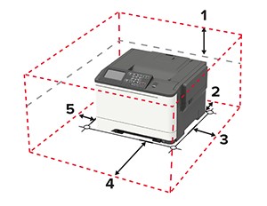 1Top254 mm (10 in.)2Rear102 mm (4 in.)3Right side76 mm (3 in.)4Front508 mm (20 in.)The minimum space needed in front of the printer is 75 mm (3 in.)5Left side76 mm (3 in.)