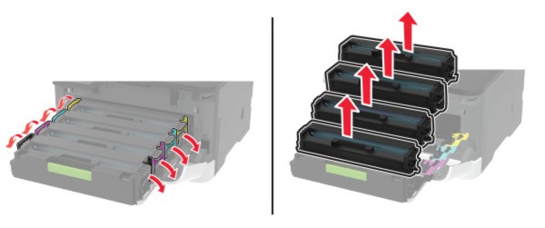 - Open the front door, and then firmly push it down.Pull out the print cartridge tray.Remove, and then insert the print cartridges.