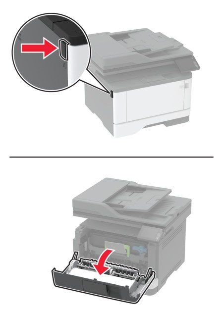 - Open the front door.To prevent damage from electrostatic discharge, touch any exposed metal frame of the printer before accessing or touching interior areas of the printer.