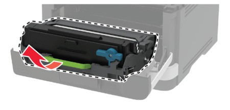 - Unpack the new imaging unit, and then insert the toner cartridge until itclicksinto place.Do not expose the imaging unit to direct light for more than 10 minutes. Extended exposure to light may cause print quality problems.Do not touch the photoconductor drum. Doing so may affect the quality of future print jobs.