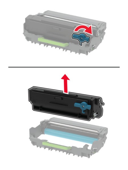 - Twist the blue latch, and then remove the toner cartridge from the used imaging unit.