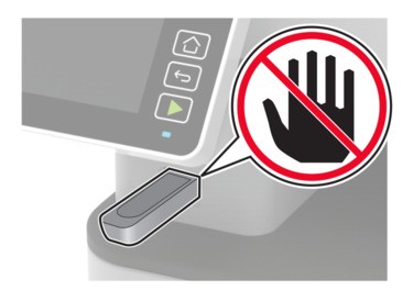 Select the document that you want to print.If necessary, configure other print settings.Print the document.To print another document, selectUSB Drive.To avoid loss of data or printer malfunction, do not touch the flash drive or the printer in the area shown while actively printing, reading, or writing from the memory device.