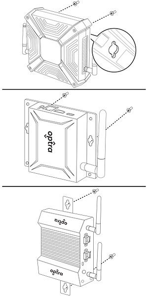 The bracket must be oriented correctly to allow clearance for rubber pads on the bottom of the device. - Hold the device against the wall temporarily, and then mark two holes on the wall corresponding to the holes on the device.For Optra Compute CX2000, you can also mount the device using the four corner holes. These holes require #4 or M4 screws.Drill holes about an inch deep into the markings on the wall.