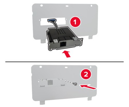Unpack the fax card.Attach the fax card to the hard disk cover.