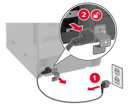 Connect the power cord to the printer, and then to the electrical outlet.To avoid the risk of fire or electrical shock, connect the power cord to an appropriately rated and properly grounded electrical outlet that is near the product and easily accessible.Turn on the printer.