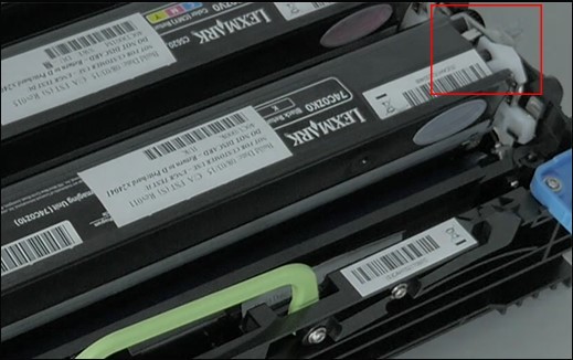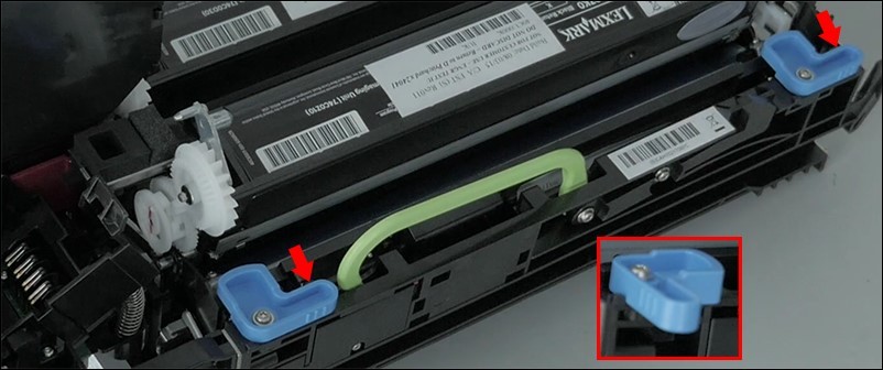 - Unlock theDHDA(developer hold down arm) by turning both blue levers; this disengages the 4 Imaging Units (developer unit and photoconductor).
