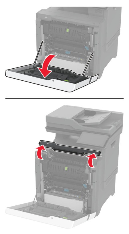 - Turn off the printer, and then unplug the power cord from the electrical outlet.Open door A, and then open door A1.The inside of the printer might be hot. To reduce the risk of injury from a hot component, allow the surface to cool before touching it.