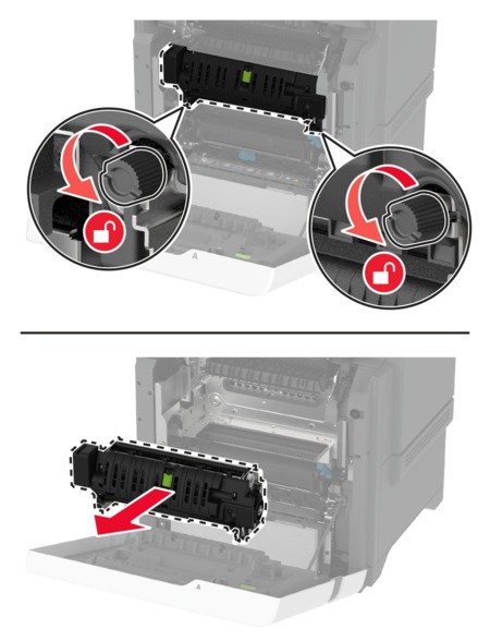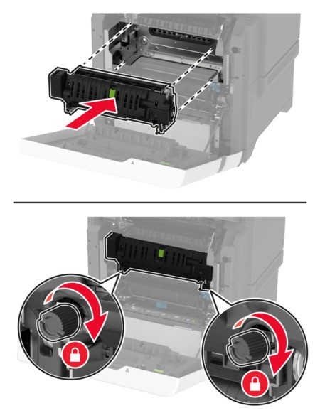 Close door A1, and then close door A.Connect the power cord to the electrical outlet, and then turn on the printer.To avoid the risk of fire or electrical shock, connect the power cord to an appropriately rated and properly grounded electrical outlet that is near the product and easily accessible.Reset the fuser maintenance counter.For more information, see Resetting the maintenance counter.
