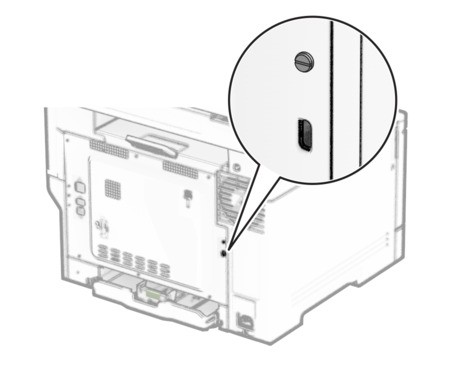 The printer is equipped with a security lock feature. Attach a security lock compatible with most laptop computers in the location shown to secure the printer in place.