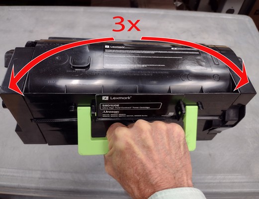 - Take hold of the cartridge by the handle as shown. Raise the cartridge into the air and tip it toward each end several times.