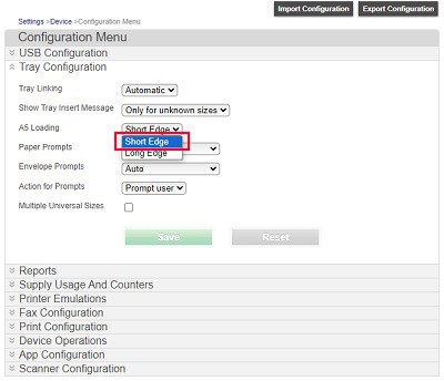 When attempting to change the paper size for an option tray to the A5 paper size, the option does not appear in the drop-down menu, and therefore cannot be selected.