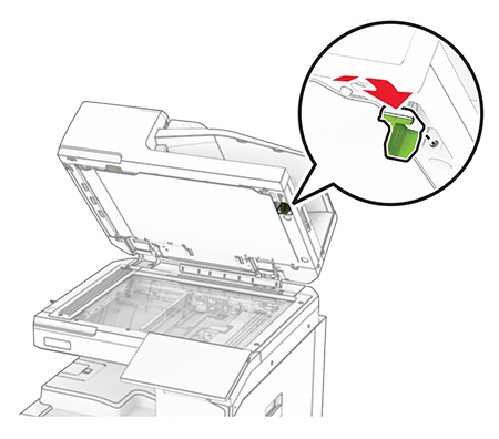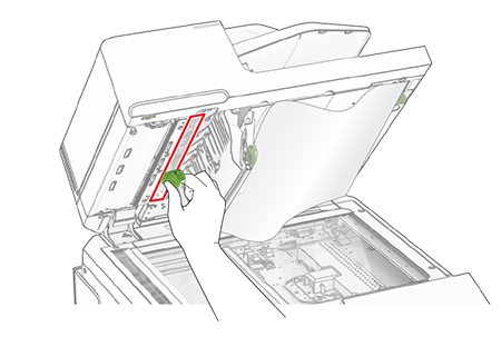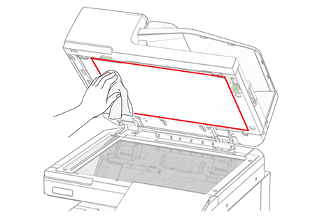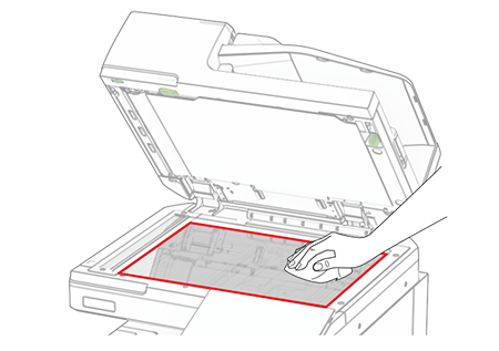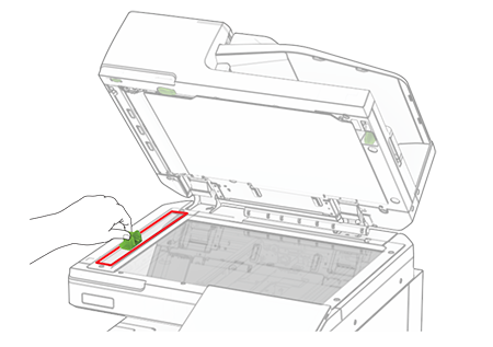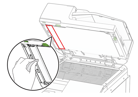 Close door A1.Using a damp, soft, lint-free cloth, wipe the following areas:- ADF glass pad