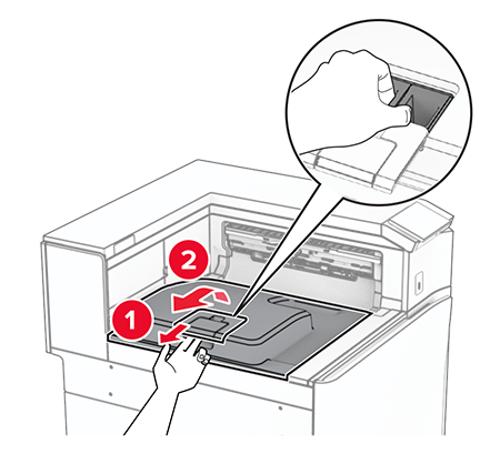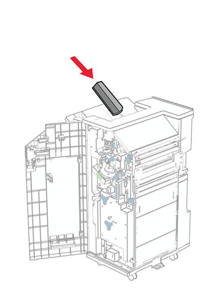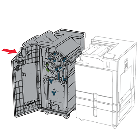 Open the finisher door.Remove the packing material from the hole punch box, and then insert it into the finisher.