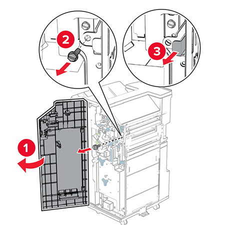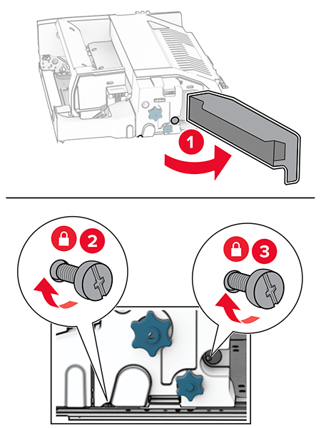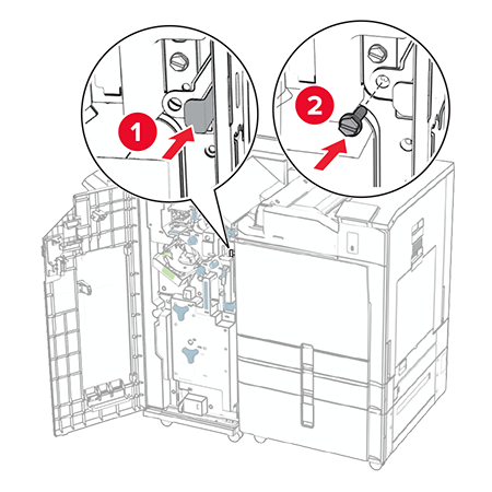 Open the finisher door, remove the screw, and then pull the finisher lock.