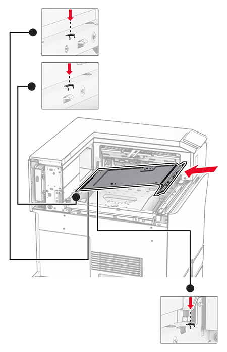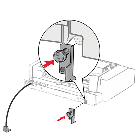 Insert the option.Make sure that the metal bracket is in front of the printer.