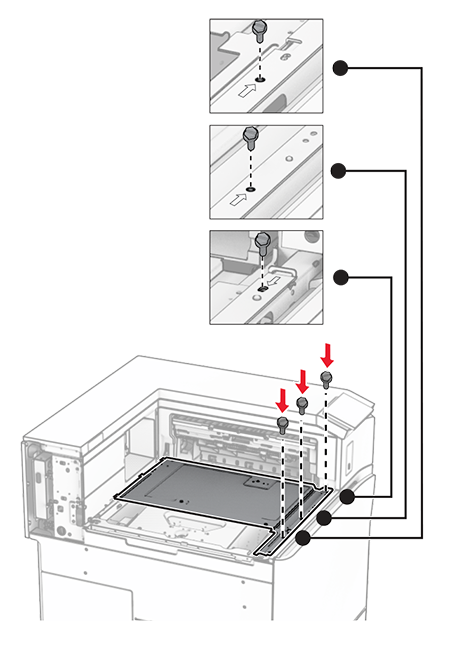 Tighten the screws to secure the mounting bracket onto the printer.Align the screws to the markers on the mounting bracket.