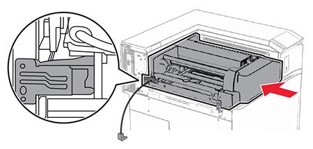 Close the finisher door.Connect one end of the power cord to the printer, and then the other end to the electrical outlet.To avoid the risk of fire or electrical shock, connect the power cord to an appropriately rated and properly grounded electrical outlet that is near the product and easily accessible.Turn on the printer.