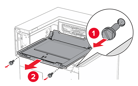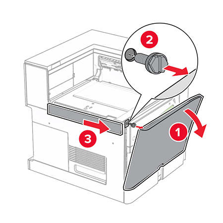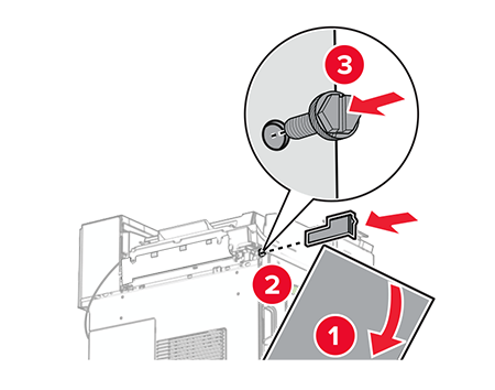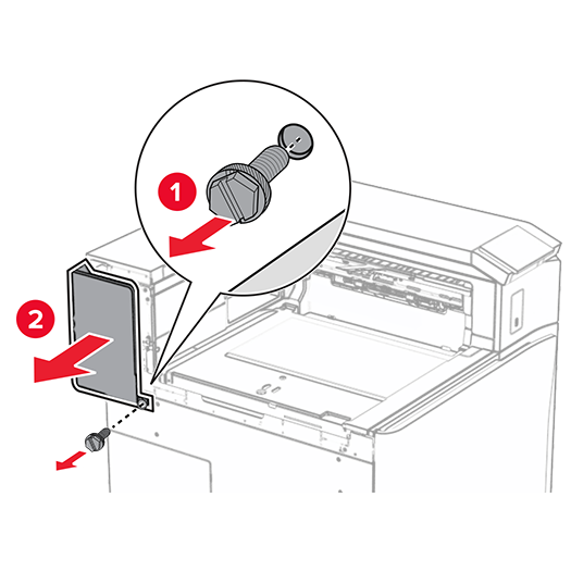 Open the front door, and then remove the cover on the left side of the printer.Do not throw away the screw and cover.