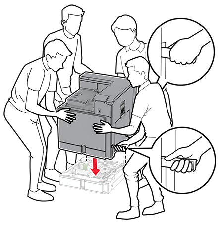 Align the printer with the 550‑sheet tray, and then lower it into place.If the printer weight is greater than 20 kg (44 lb), then it may require two or more people to lift it safely.