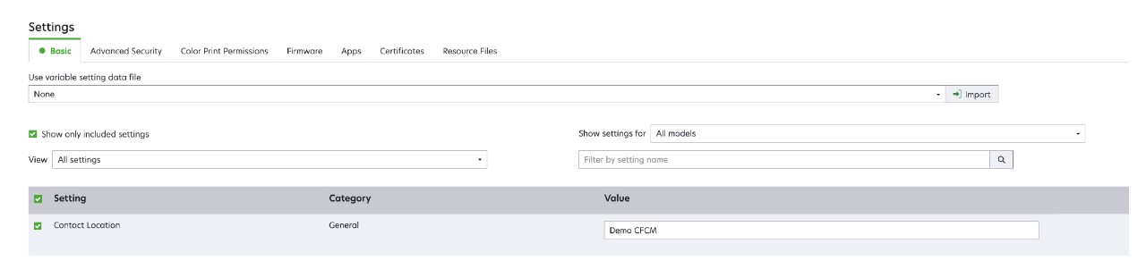 A configuration is a collection of settings that can be assigned and enforced to a printer or a group of printers. Within a configuration, you can modify printer settings and deploy applications, licenses, firmware, and CA certificates to printers.