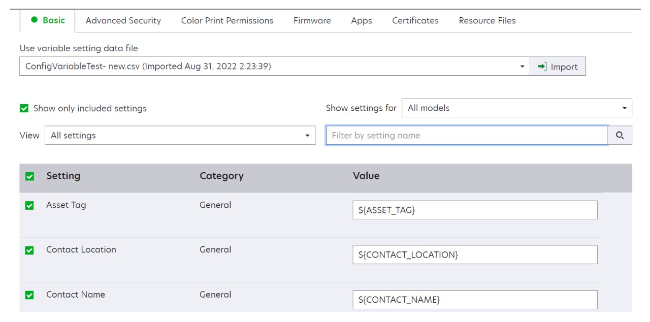 - From the Basic tab, select one or more settings, and then specify the values. If the value is a variable setting, then enclose the header with${}. For example,${Contact_Name}. To use a variable setting file, select the file from the Use variable setting data file menu, or import the file. For more information, see Understanding variable settings.
