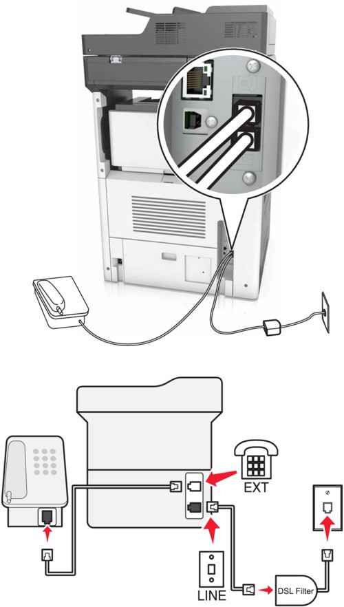 - Conecte un extremo del cable telefónico al puerto LINE de la impresora. Conecte el otro extremo al puerto telefónico del filtro DSL.