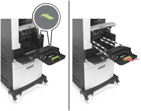 Introduzca la unidad de imagen en la impresora alineando las flechas de los carriles laterales de la unidad con las flechas de los carriles laterales dentro la impresora.