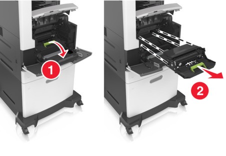 Levante la palanca verde y, a continuación, extraiga la unidad de imagen de la impresora.