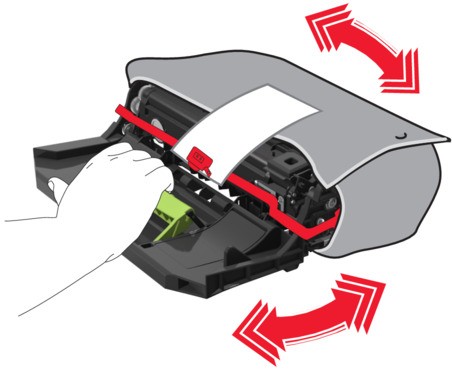 Introduzca el cartucho de tóner en la impresora alineando los carriles laterales del cartucho con las flechas de los carriles laterales dentro la impresora.