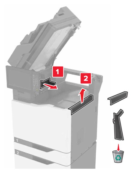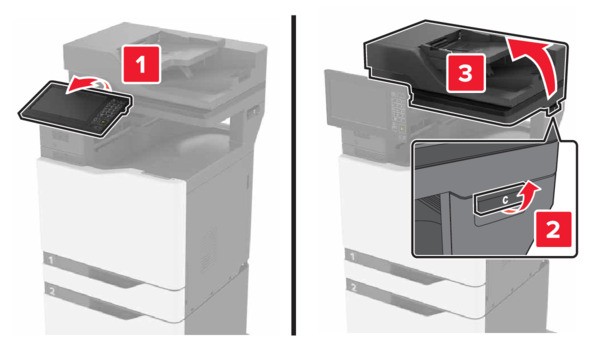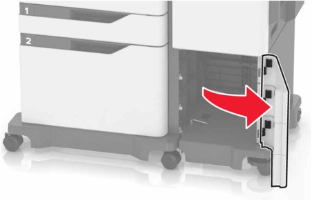 Cuando el dispositivo de acabado esté fijado, haga lo siguiente:- Abra la puerta frontal inferior del dispositivo.