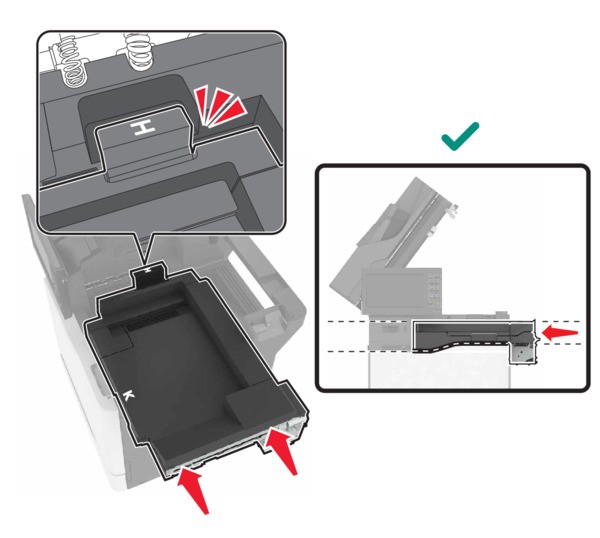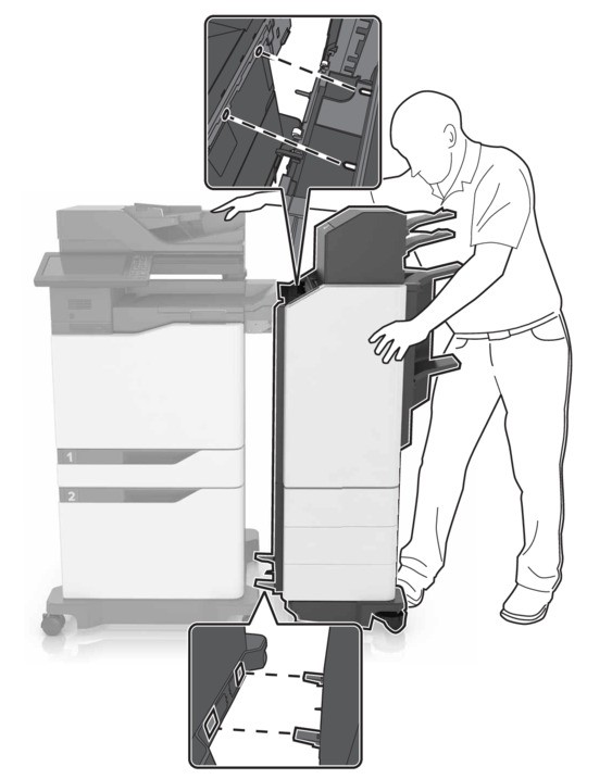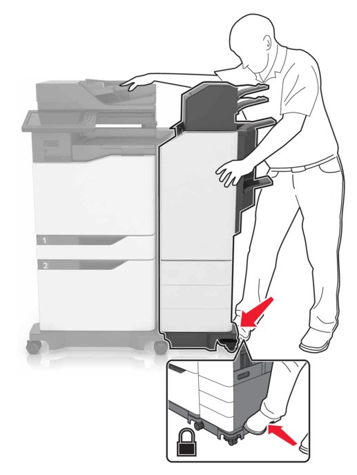 Empuje el dispositivo de acabado hacia la impresora, a continuación, aplique presión en la parte inferior del dispositivo con el pie hasta quehaga clicen su lugar.