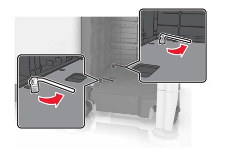 Cierre la puerta.Compruebe la separación entre la impresora y el dispositivo de acabado. Si la separación es desigual, gire las ruedas laterales del dispositivo de acabado en el sentido de las agujas del reloj.