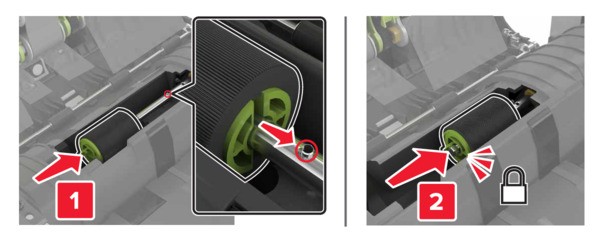Desembale el nuevo rodillo de separación del ADF.Inserte el nuevo rodillo de separación del alimentador automático de documentos hasta quehaga clicen su lugar.
