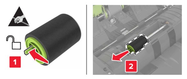 Retire el rodillo de separación del ADF.La electricidad estática puede dañar fácilmente algunas piezas de la impresora. Antes de tocar alguna de las piezas o componentes en un área marcada con el símbolo de sensibilidad a la electricidad estática, toque la superficie metálica de un área apartada del símbolo.