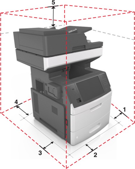 - Deje el siguiente espacio recomendado alrededor de la impresora para conseguir una ventilación correcta: