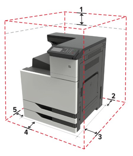 - Deje el siguiente espacio recomendado alrededor de la impresora para conseguir una ventilación correcta: