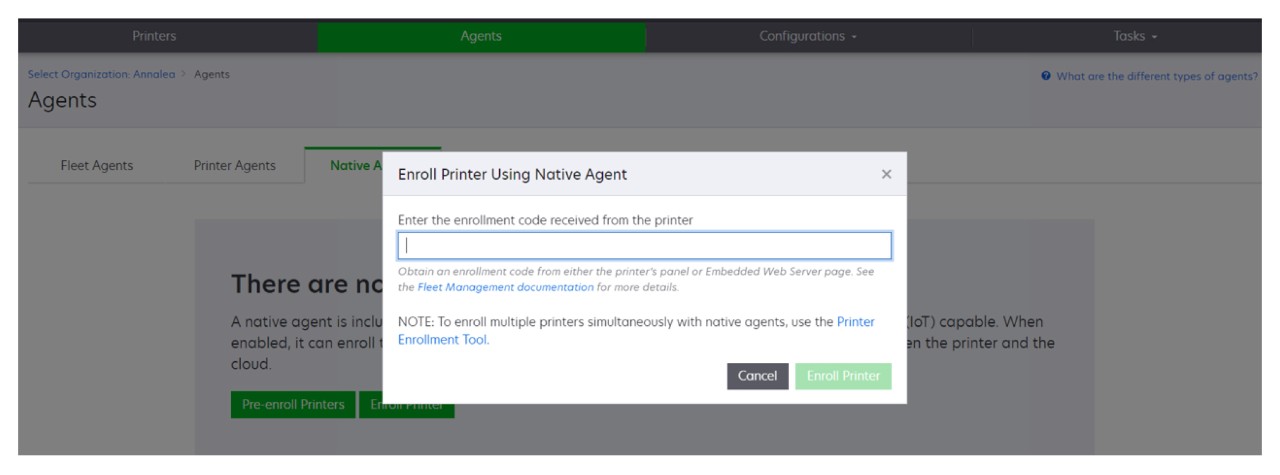 - Haga clic enAgentes>Native Agents>Inscribir impresora, introduzca el código de inscripción y, a continuación, haga clic enInscribir impresora.