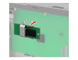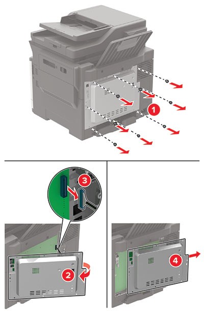 - Apague la impresora.Desconecte el cable de alimentación de la toma eléctrica y, a continuación, de la impresora.Con un destornillador de punta plana, retire la cubierta de acceso de la placa del controlador.Los componentes electrónicos de la placa del controlador se dañan fácilmente con la electricidad estática. Toque primero una superficie metálica en la impresora antes de tocar ningún conector o componente de la placa del controlador.