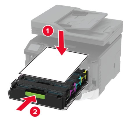 Para evitar restos de contaminación de tóner, coloque una hoja de papel en la parte superior de la bandeja del cartucho de impresión y, a continuación, inserte la bandeja del cartucho de impresión.