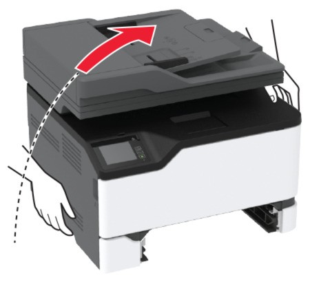 - Apague la impresora.Desconecte el cable de alimentación de la toma eléctrica y, a continuación, de la impresora.Abra la puerta frontal y, a continuación, empújela hacia abajo con determinación.