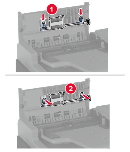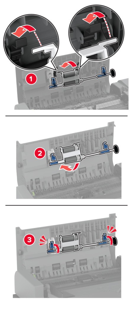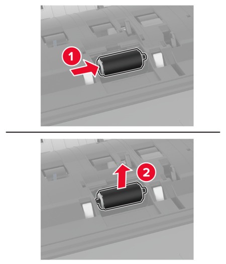 Aplique agua a un paño suave que no suelte pelusa y, a continuación, limpie el kit de rodillos.Inserte el conjunto del rodillo de separación hasta quehaga clicen su lugar.